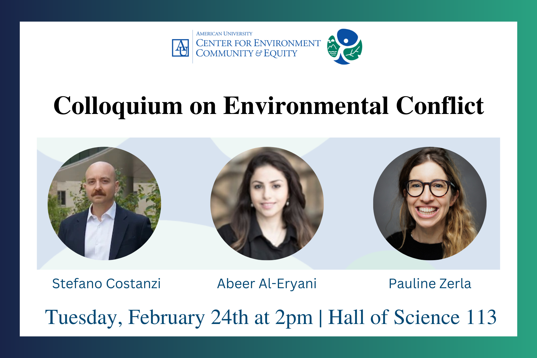 Our February colloquium will feature Stefano Costanzi, Abeer Al-Eryani, and Pauline Zerla as they discuss their work on conflict and how it impacts the environment.