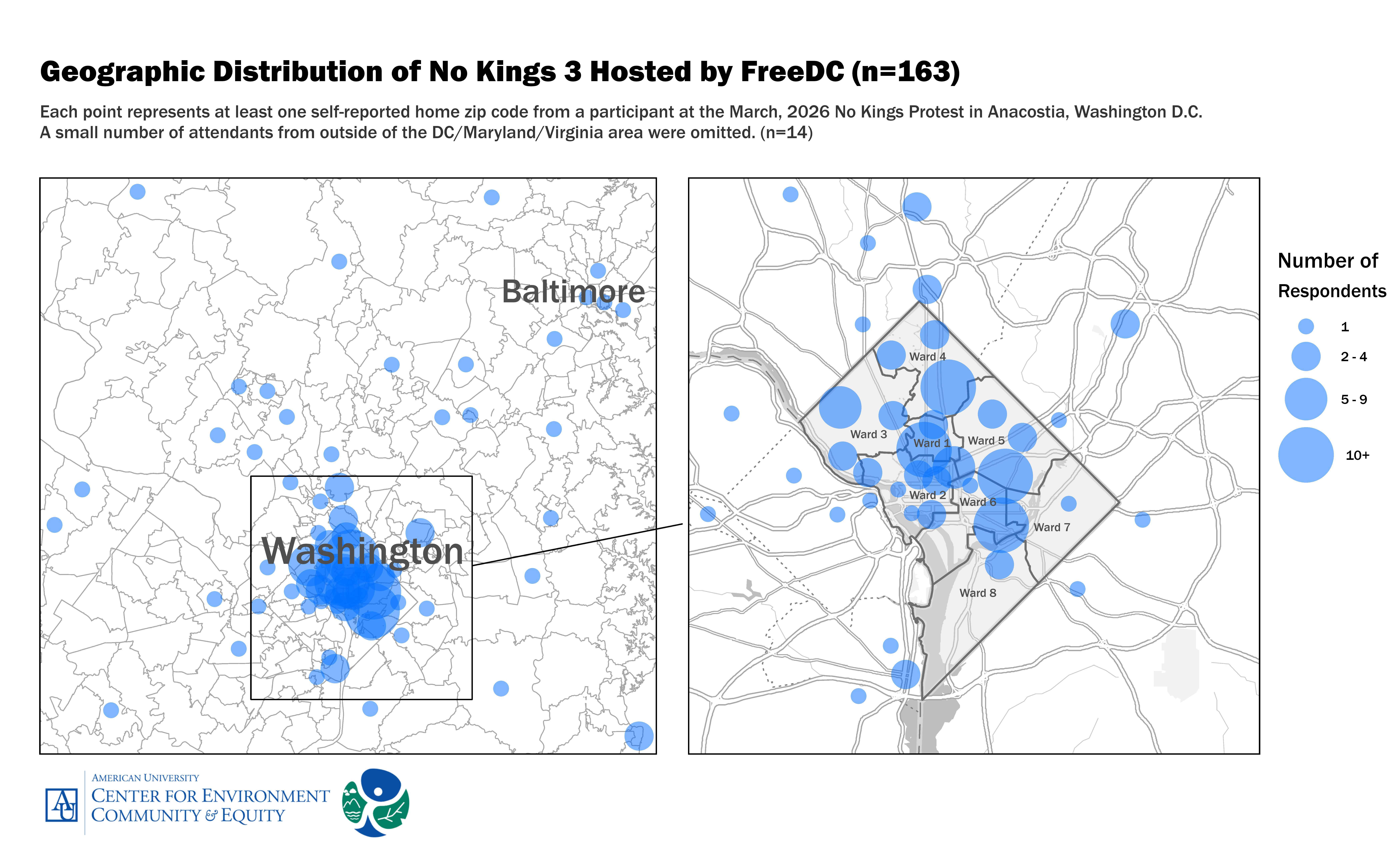 Our data show that the protest in DC mobilized people who came predominantly from the local area: approximately 85% of respondents reported a home zip code within the District of Columbia, and 13% of them were from Ward 8 (where the protest took place) or an adjacent Ward. Although the city attracts protestors from all over the country, No Kings 3 was peopled by locals. The event was organized by the local group–FreeDC–and was cosponsored by a number of unions. The data we collected at the event provides evidence that local organizations can mobilize local solidarity through events like No Kings 3. The impact of this localization of protest is that the protest is more representative of the issues and organizations that construct the immediate political landscape. It also allows for a greater ability for local organizations to recruit.