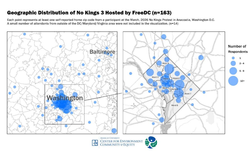 Our data show that the protest in DC mobilized people who came from the local area: approximately 85% of respondents reported a home zip code within the district, and 13% of those respondents were from Ward 8 (where the protest took place) or an adjacent Ward. Although the city attracts protestors from all over the country, No Kings 3 was peopled by locals. The event was organized by the local group, FreeDC and was cosponsored by a number of unions. The data we collected at the event provides evidence that local organizations can mobilize local solidarity through events like No Kings 3. The impact of this localization of protest is that the protest is more representative of the issues and organizations that construct the political landscape. It also allows for a greater ability for local organizations to recruit.