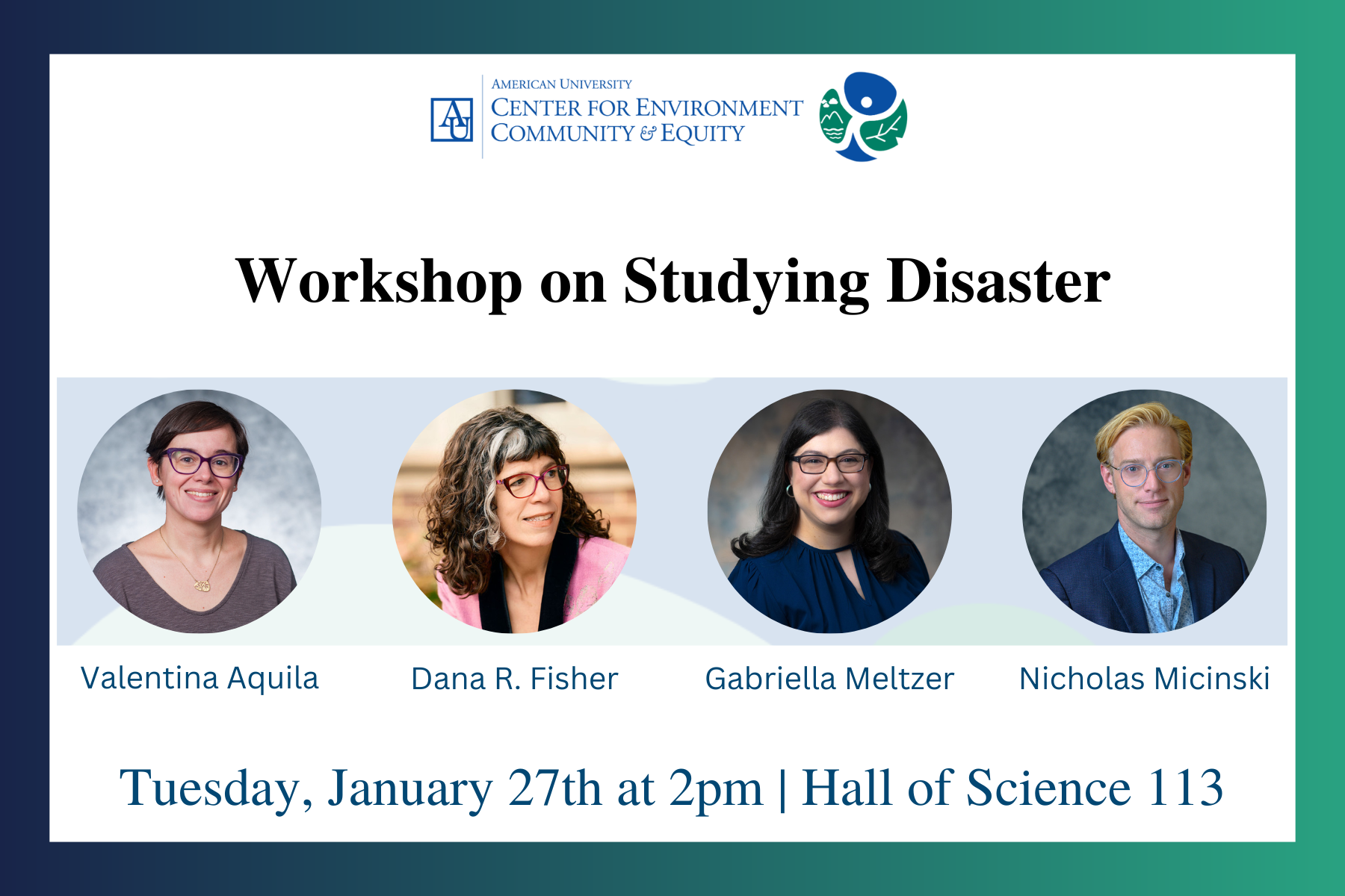 Our January colloquium, a Workshop on Studying Disasters at AU, will feature Valentina Aquila, Dana R. Fisher, Gabriella Meltzer, and Nicholas Micinski as they discuss their work on disasters, the intersection with climate change, and how it impacts people.
